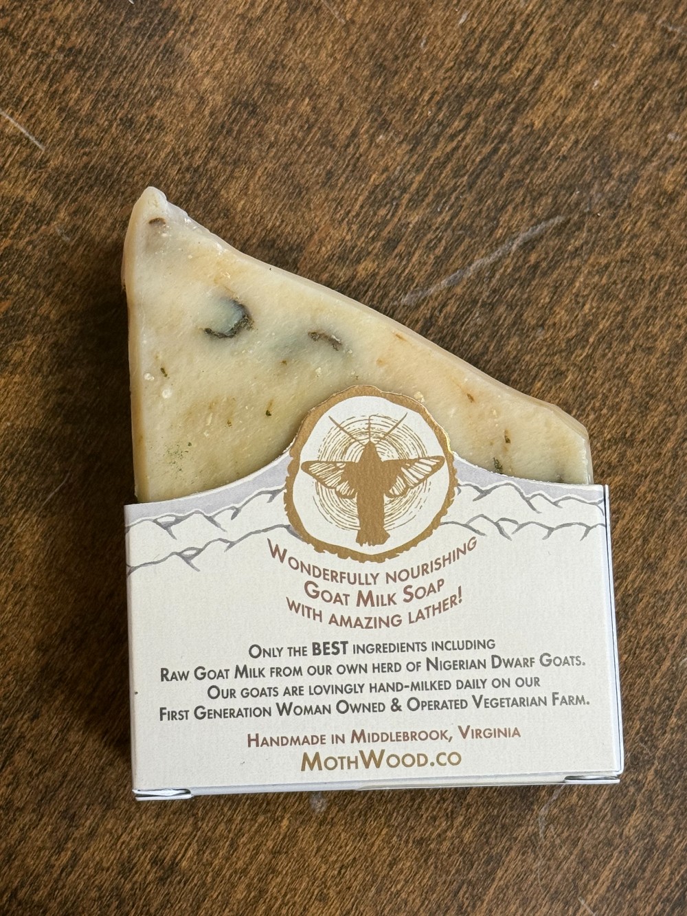This Goat Milk Soap is made with Olive oil, Coconut Oil, Shea Butter and other 100% Natural ingredients! The scent is Peppermint. Made by Moth Wood in Middlebrook Virginia! Cruelty Free