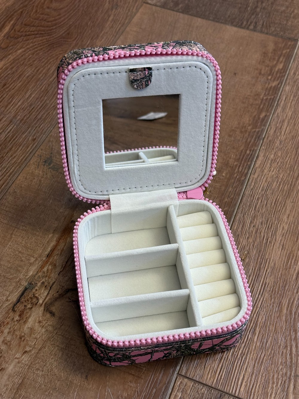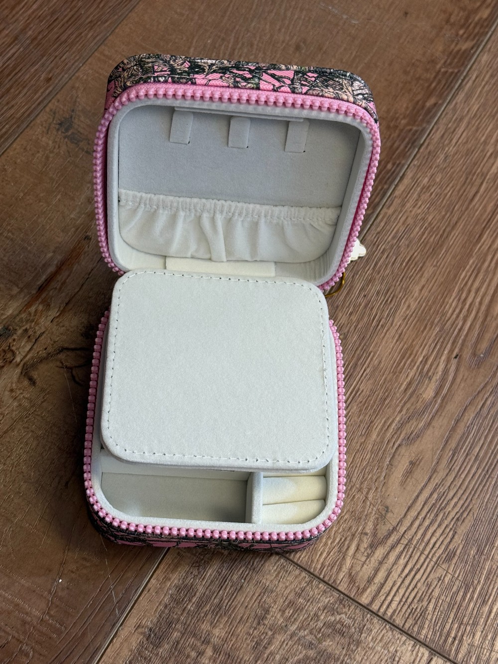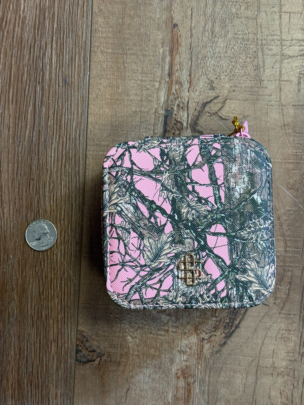 Simply Southern Pink Camo jewelry travel case. Square shaped with holders for rings, earrings, and more! With 2 main compartments and a pink zipper to close! Quarter for size comparison. Brand: Simply Southern Color: Pink Camo